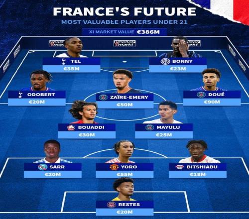 北京时间10月12日,德转市场列出了法国身价最高的U21球员阵容,其中巴黎球员杜埃以9000万欧居首。