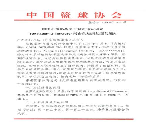 中国篮协在给广东东阳光队(广东宏远篮球俱乐部)下发的通知中说:“在国家体育总局反兴奋剂中心于2025年4月16日实施的赛内(2024-2025赛季CBA)兴奋剂检查中,你单位男子篮球运动员Troy Akeem Gillenwater(吉伦沃特)的A样本尿样检测结果呈大麻酚类(羧基四氢大麻酚)阳性。接到阳性通知后,运动员放弃检测B样本,因此该运动员检测结果阳性成立,表明运动员曾使用禁用物质或禁用方法,构成兴奋剂违规。运动员对该阳性作出了解释说明,并提供了证据材料。运动员能够证明在赛外摄入、使用禁用物质,并且与运动能力无关。接到兴奋剂违规通知后,运动员在规定时间内签署了结果管理回执单,承认兴奋剂违规,接受通知中指控的后果。”