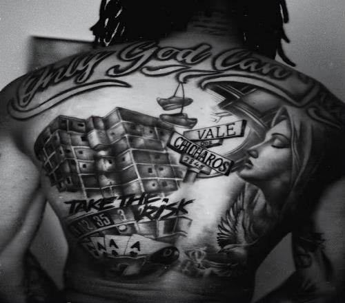 莱奥纹身的右侧是圣母玛利亚的头像,左侧是他从小生活的街区图,中间还有两块路标,上面写着莱奥家乡塞图巴尔区的邮编2845。其他地方有他认可图字母等。