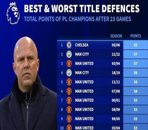 英超卫冕冠军赛季前23轮积分榜:利物浦36分列倒数第五 -